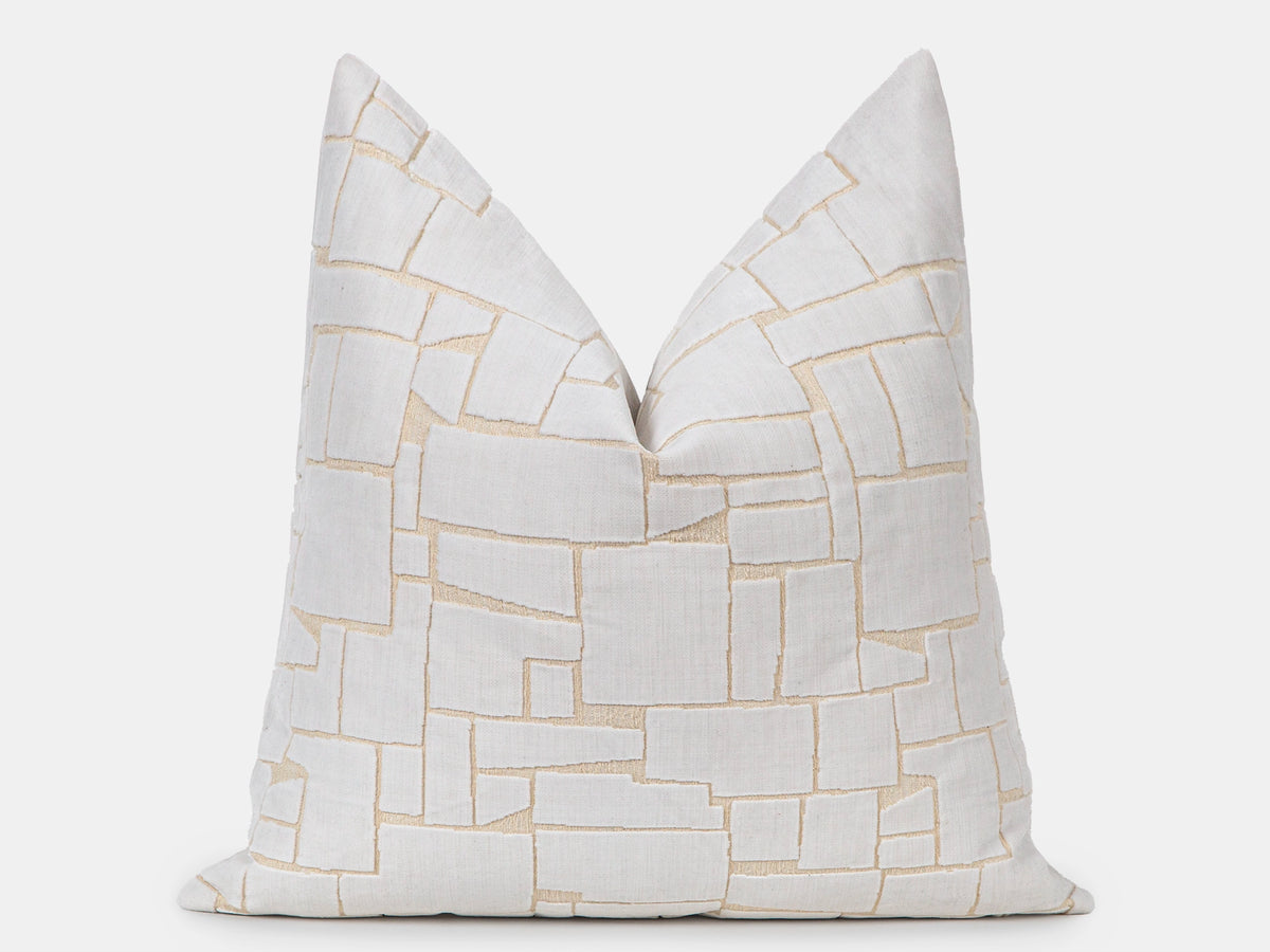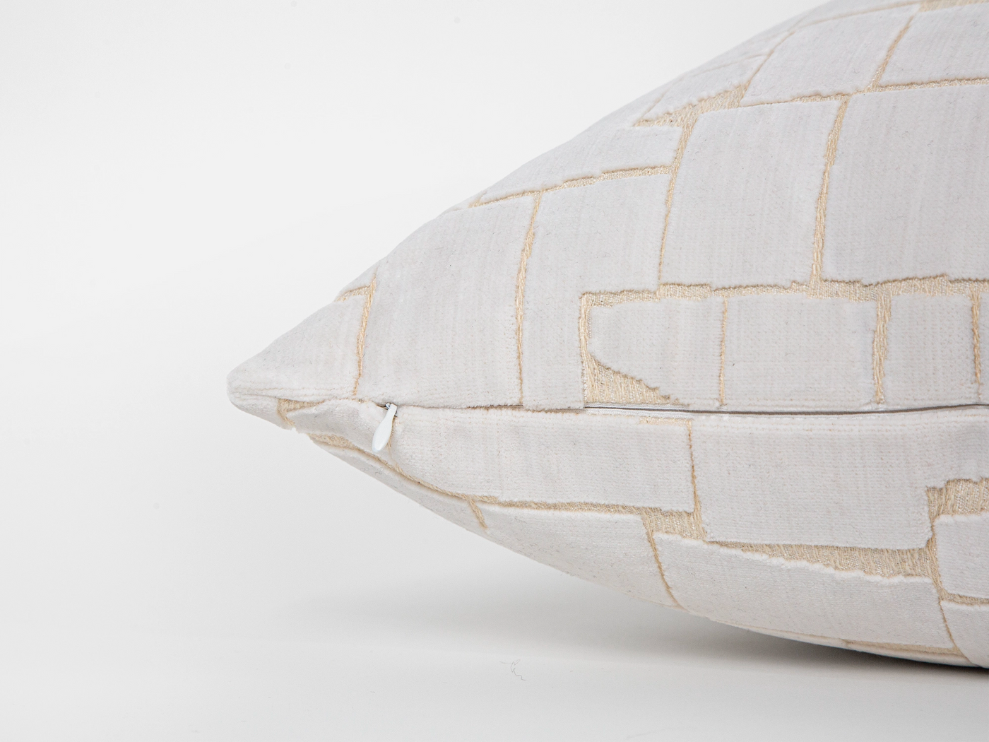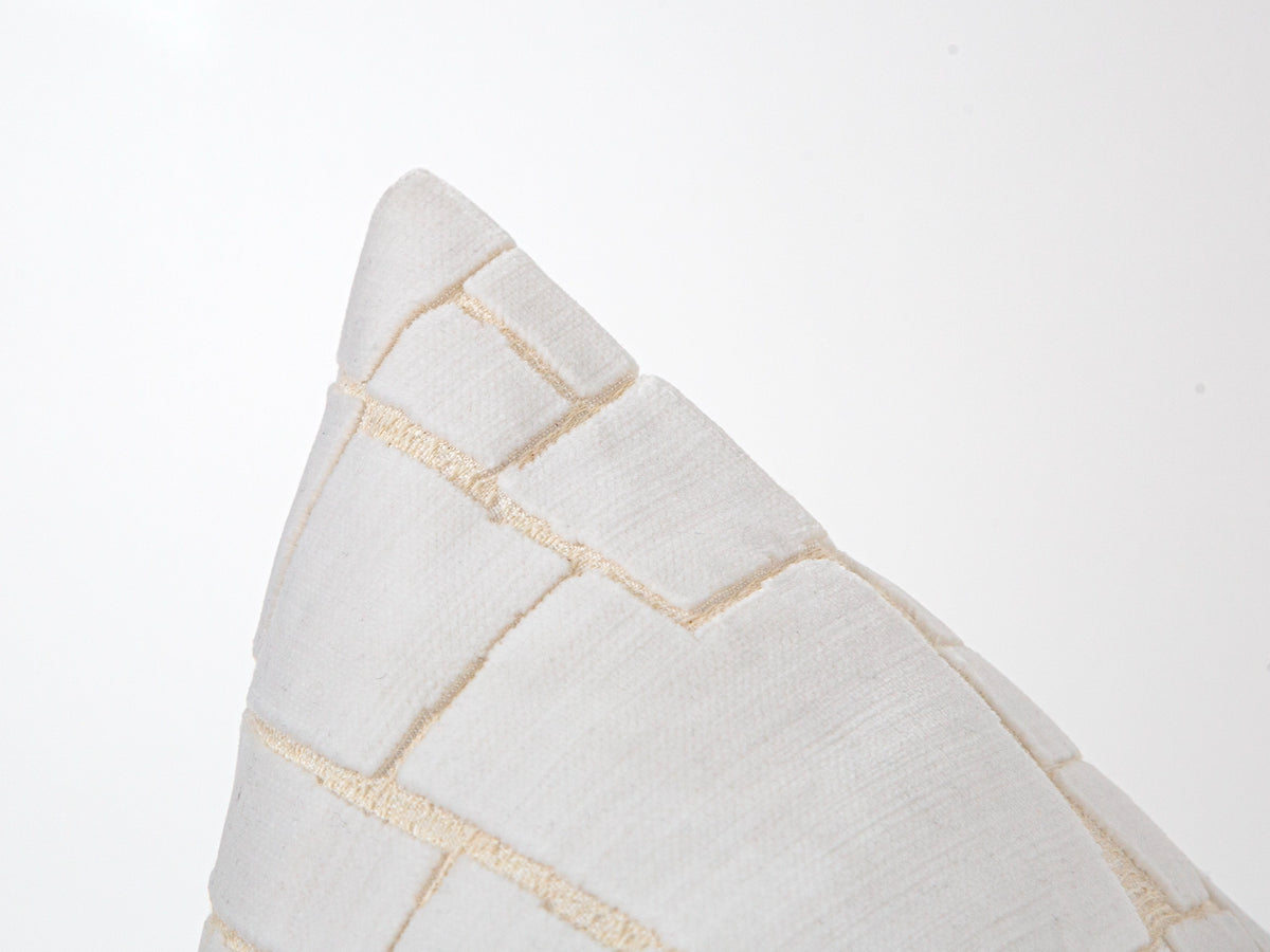 Ivory and cream-beige pillow cover with sculptural geometric pattern in thick, soft cut velvet—elegant texture for modern neutral spaces.