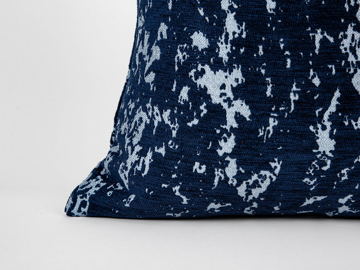 Navy blue pillow cover with a soft, textured surface and marble-inspired abstract pattern in navy and light gray. Medium thick and durable—ideal for contemporary, coastal, or transitional spaces.