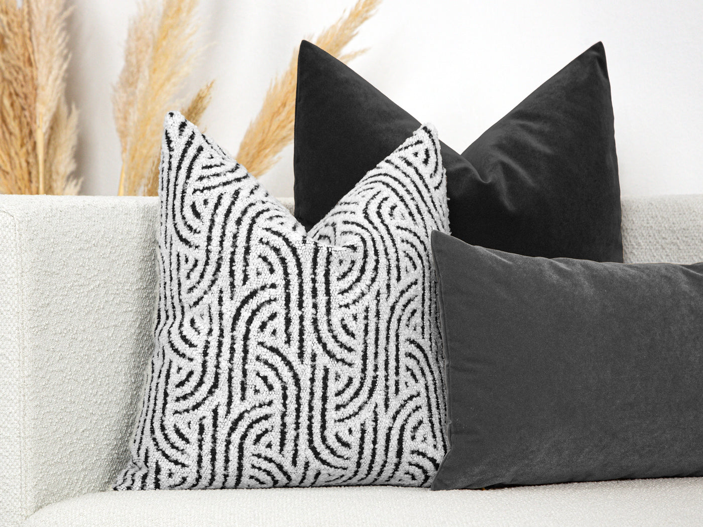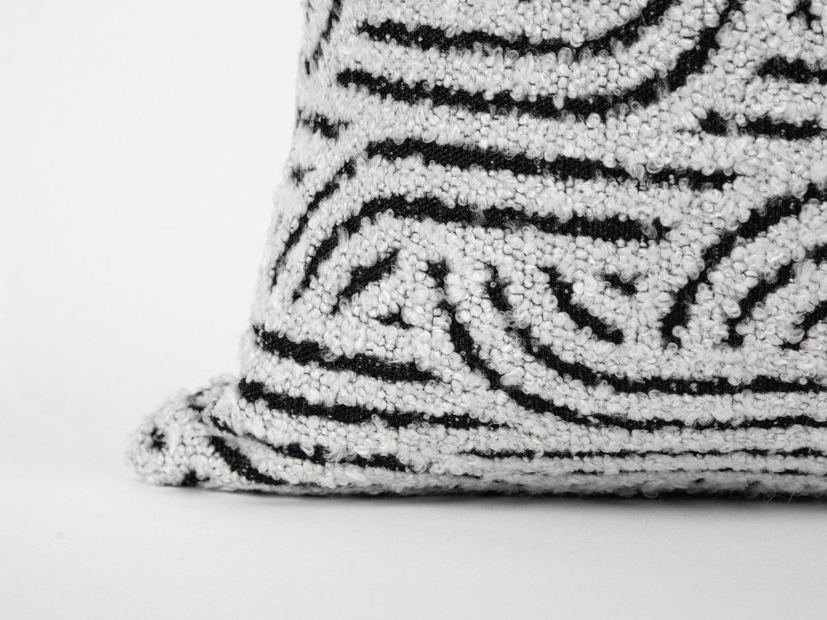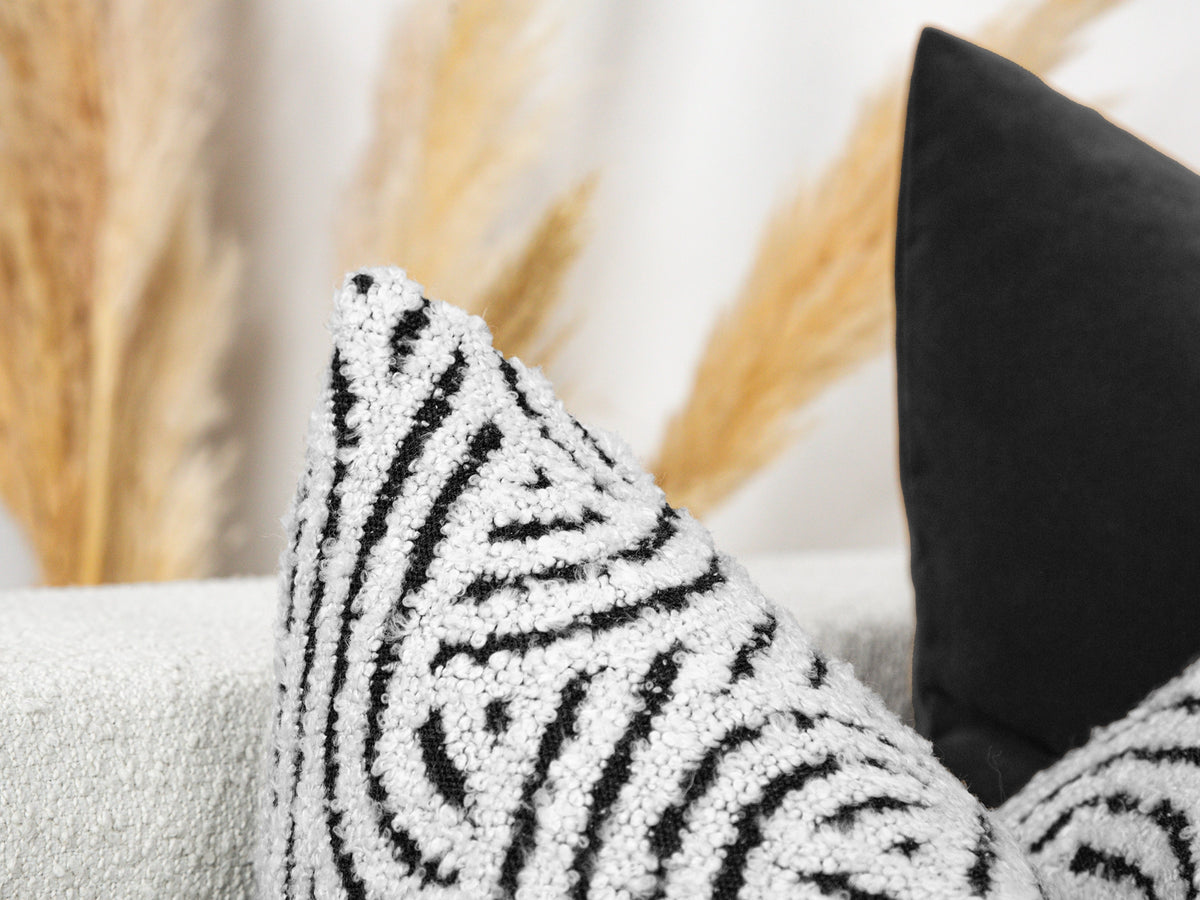 An off-white boucle pillow cover with bold black geometric pattern for modern contrast.