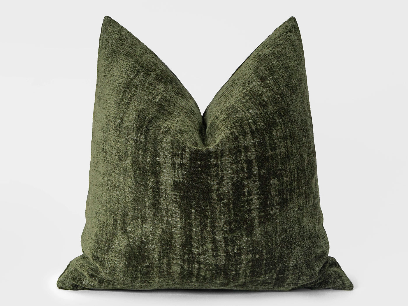 This green pillow cover features a mottled chenille texture, adding depth, warmth, and a relaxed, organic look to any space with its thick, durable fabric.
