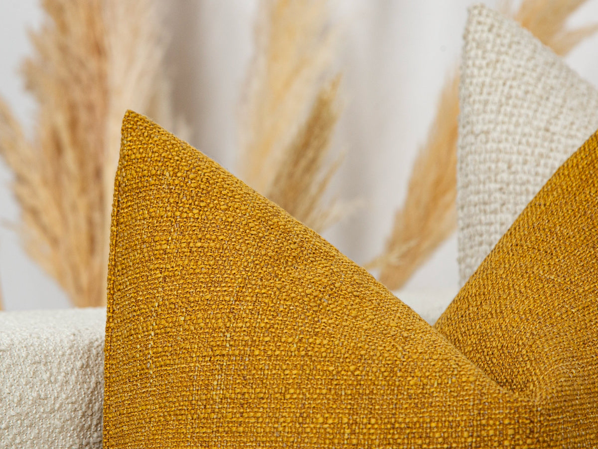 Ochre pillow cover made from medium-thick linen—naturally textured with rustic, earthy charm.