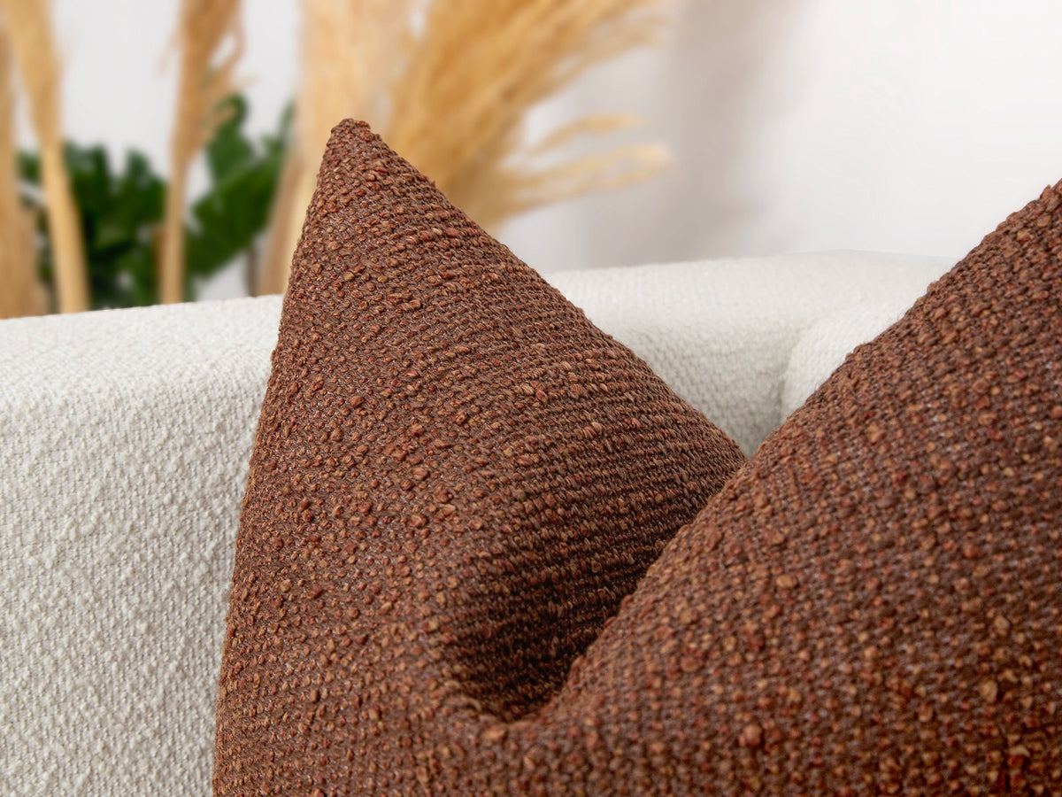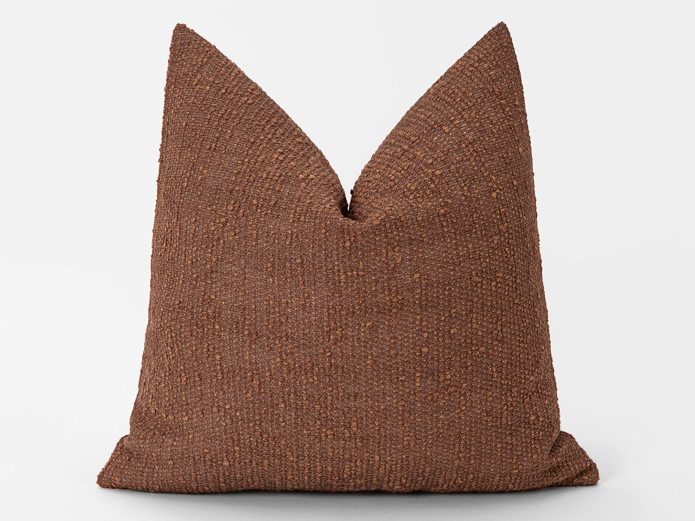 This copper pillow cover features a knotted boucle surface, adding depth, warmth, and organic charm to any space with its durable, cozy fabric.