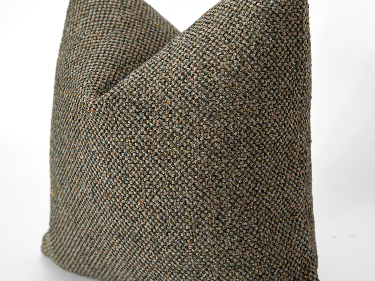 ✨ Inspired by nature's warm tones, this pillow cover features a textured checkered weave in earthy shades of teal, rust, and gray over a dark beige base.
